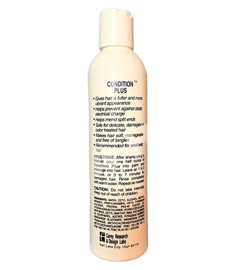 Condition Plus 8 oz (Six Pieces Per Order) After wash conditioning rinse. Especially recommended for all types of synthetic fiber and human-hair used in hair systems. Makes fiber soft and manageable, especially at the root of the base where conditioning is most important- and where the spray on type conditioner does not reach. Retards fiber breakage at the root of the base. Inhibits static build-up and fly away fiber.